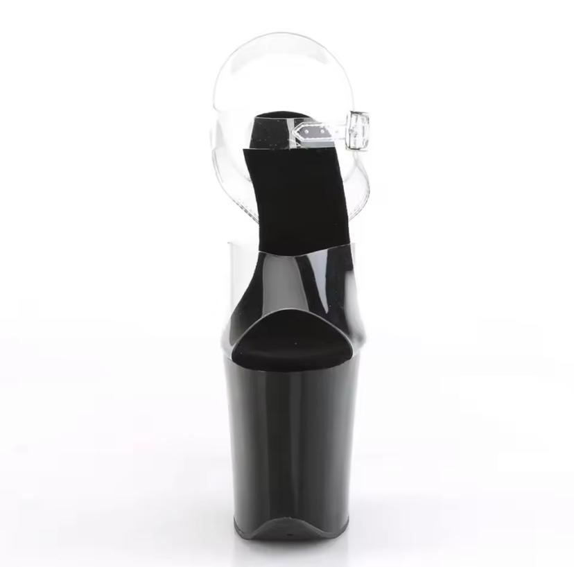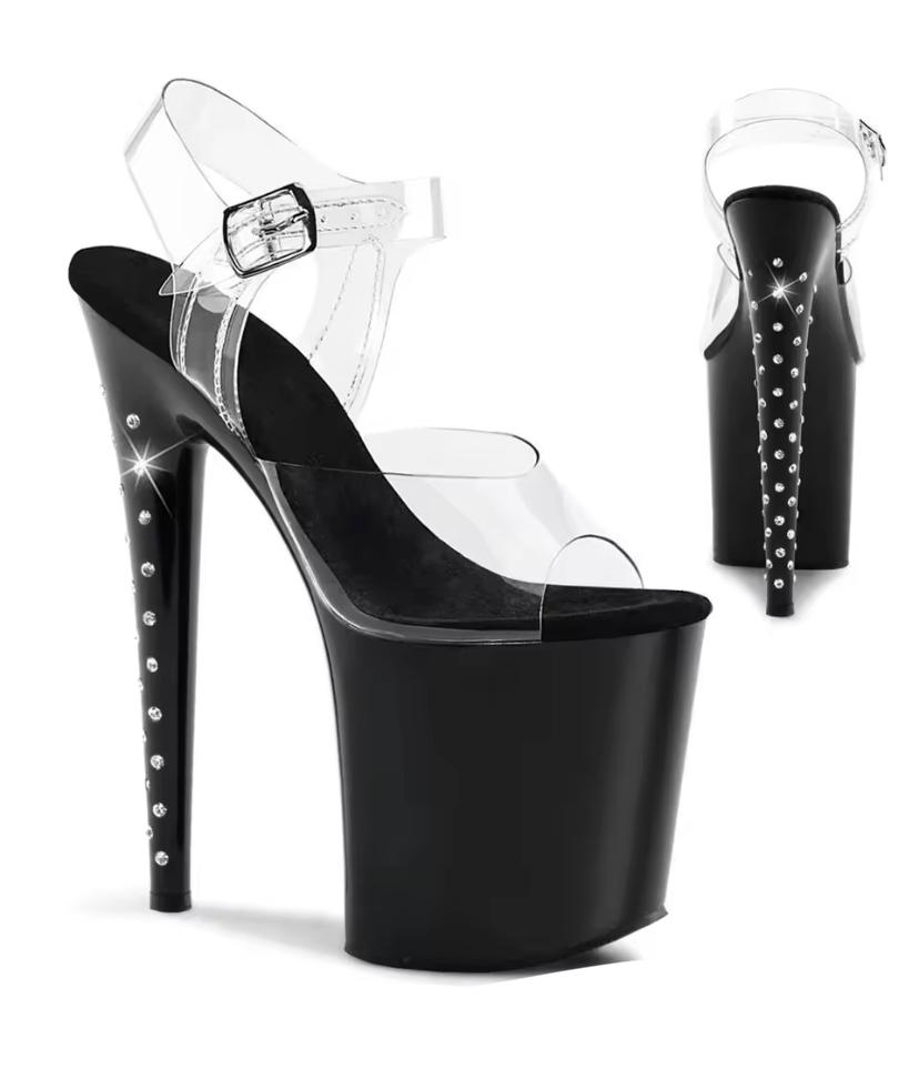 Tacones especiales para Pole Dance. Tipo sandalia, color negro con brillantes en el tacon. Tacón 20cm, plataforma 10cm.