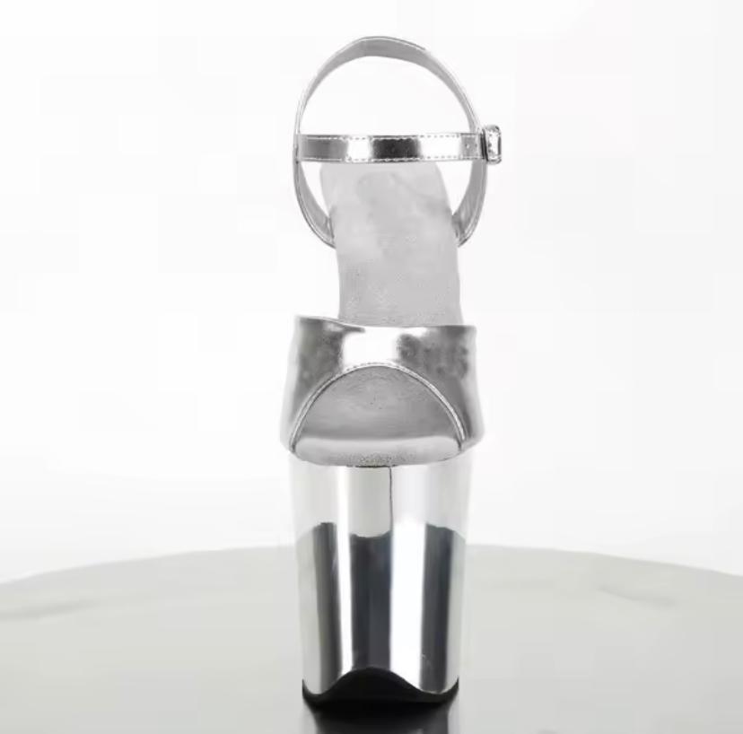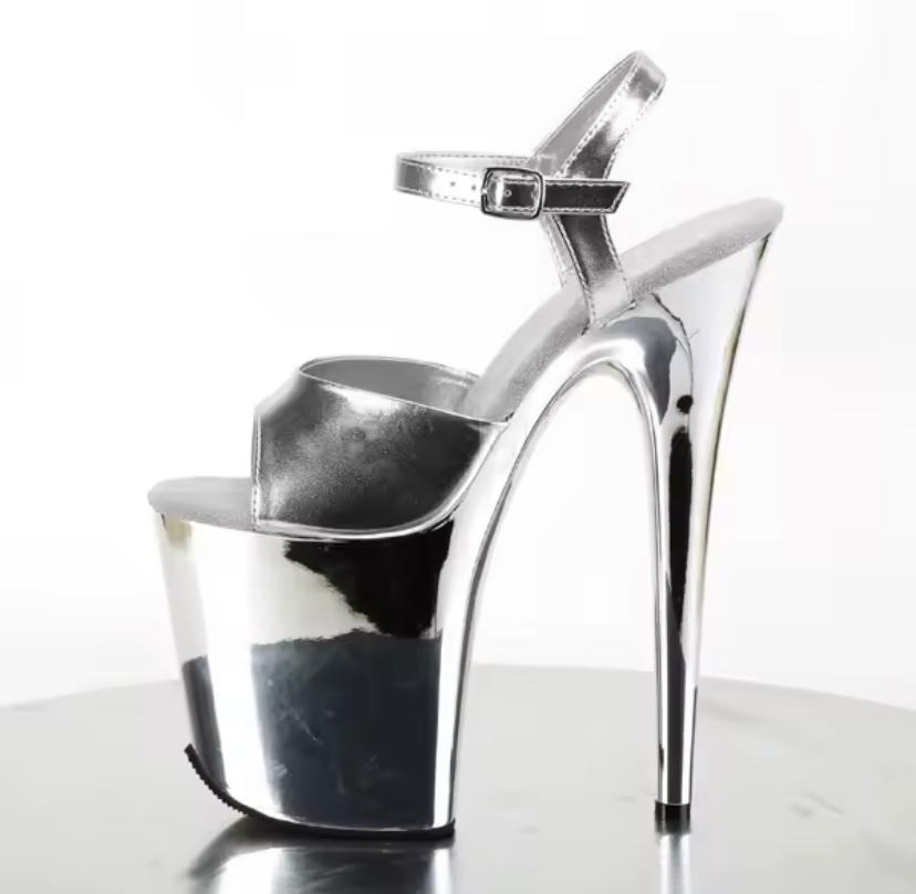 Tacones especiales para Pole Dance. Tipo sandalia, color plata. Tacón 20cm, plataforma 10cm.